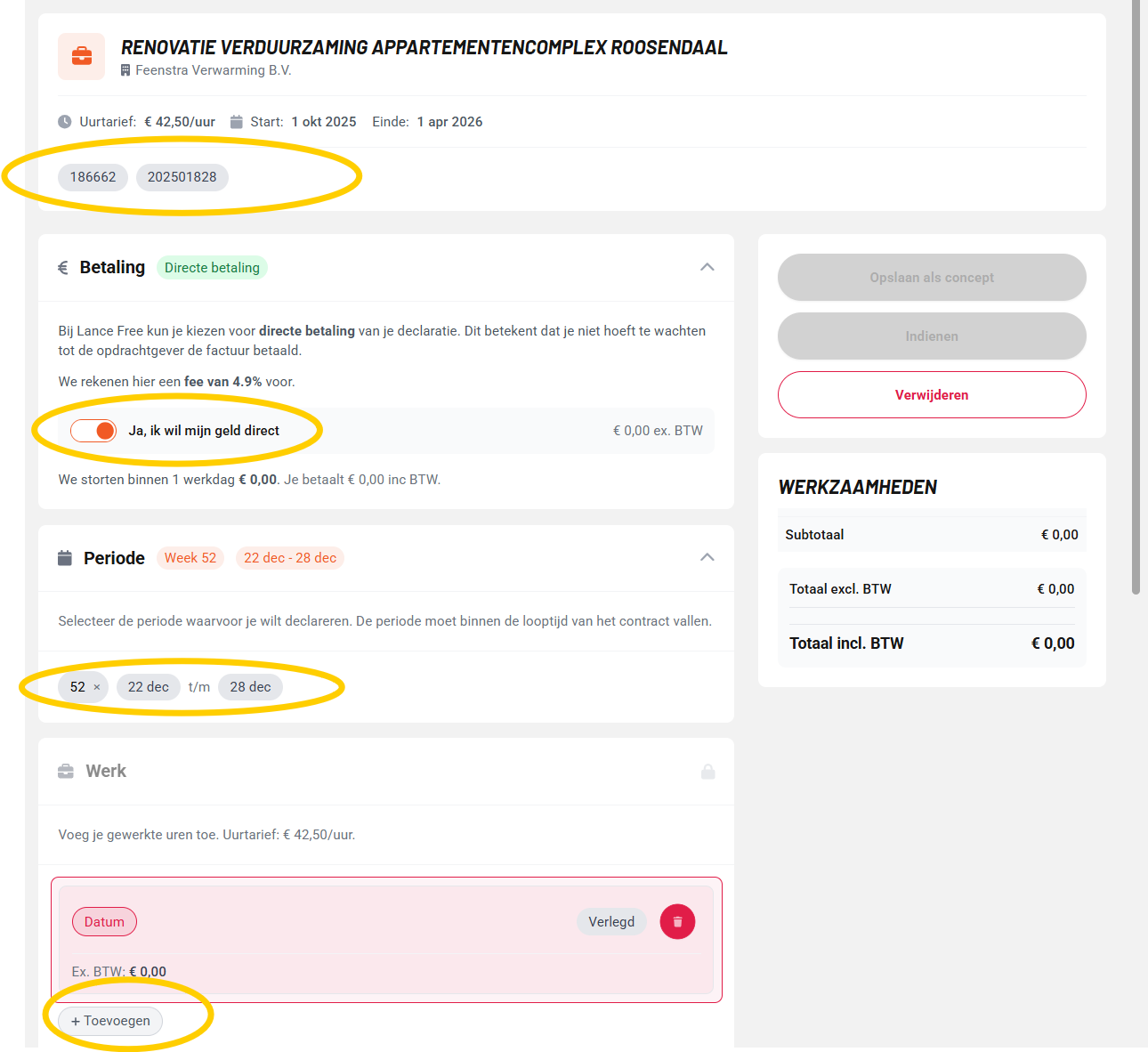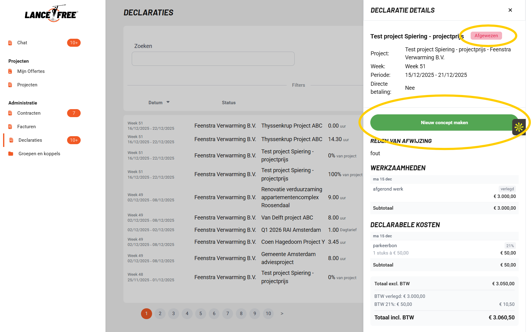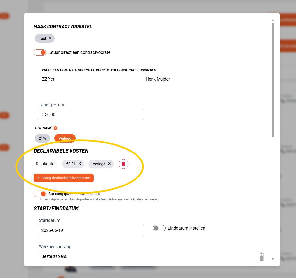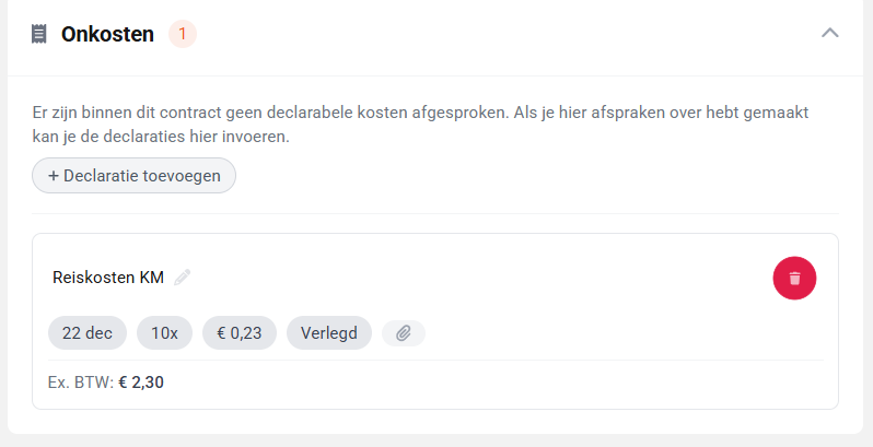 Bij het opstellen van een contract kunnen bedrijven nu exact aangeven welke declarabele kostensoorten zijn toegestaan, compleet met BTW-tarief en maximumbedrag. Wanneer een professional een declaratie indient, verschijnen deze vooraf ingestelde onkosten als knoppen die ze direct kunnen toevoegen. Dit bespaart tijd en zorgt voor consistentie.