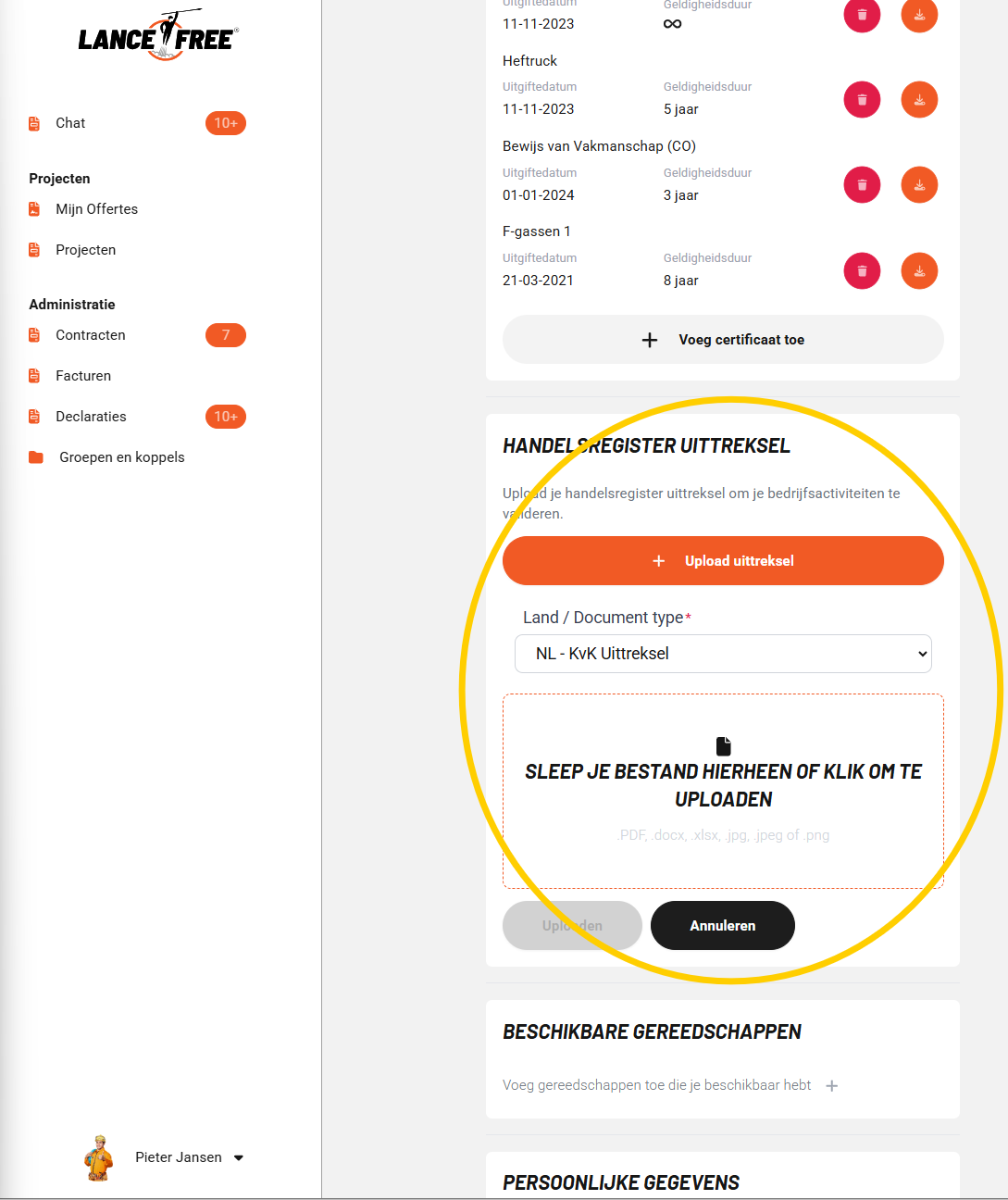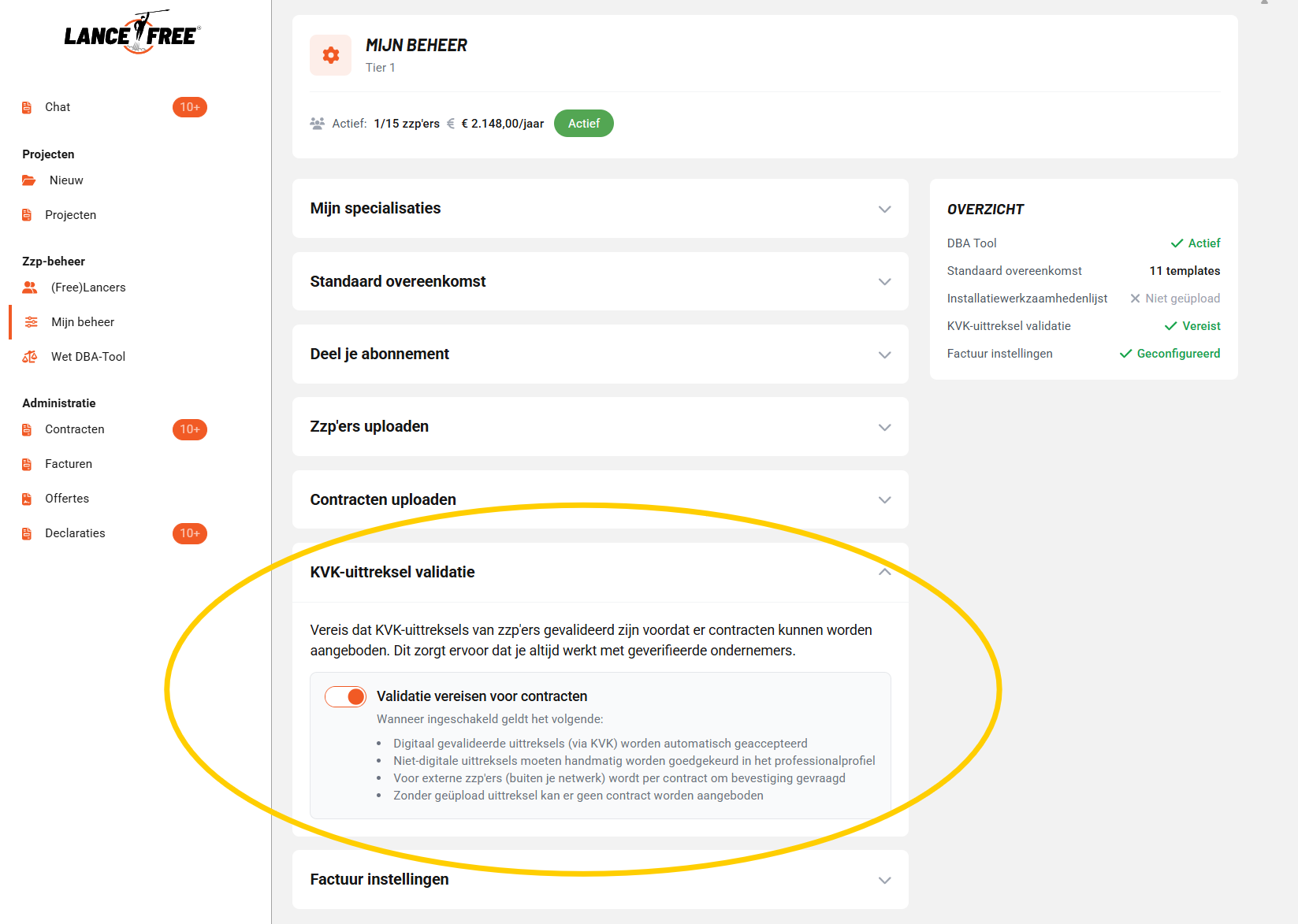 Bedrijven kunnen nu zelf instellen dat professionals verplicht een geldig bedrijfsuittreksel moeten uploaden voordat er een contract kan worden aangemaakt. Voor eerste contracten moet het uittreksel maximaal 3 maanden oud zijn, voor vervolgcontracten maximaal 12 maanden. Dit zorgt voor betere verificatie en naleving. Het KVK digitale waarmerk wordt door Lance Free automatisch gecontroleerd op echtheid in de KVK database.