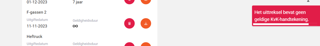 Indien het uittreksel niet digitaal gewaarmerkt is krijg je de volgende foutmelding. Dit komt doordat de Nederlandse KVK’s een digitale sleutel hebben, bij een kopie of een niet-officieel bewijs is deze sleutel niet beschikbaar en wordt het als een niet-geldig document gezien. Vraag dus altijd een officieel KVK-Uittreksel op bij de Kamer van Koophandel.