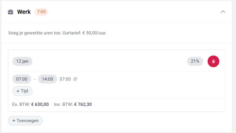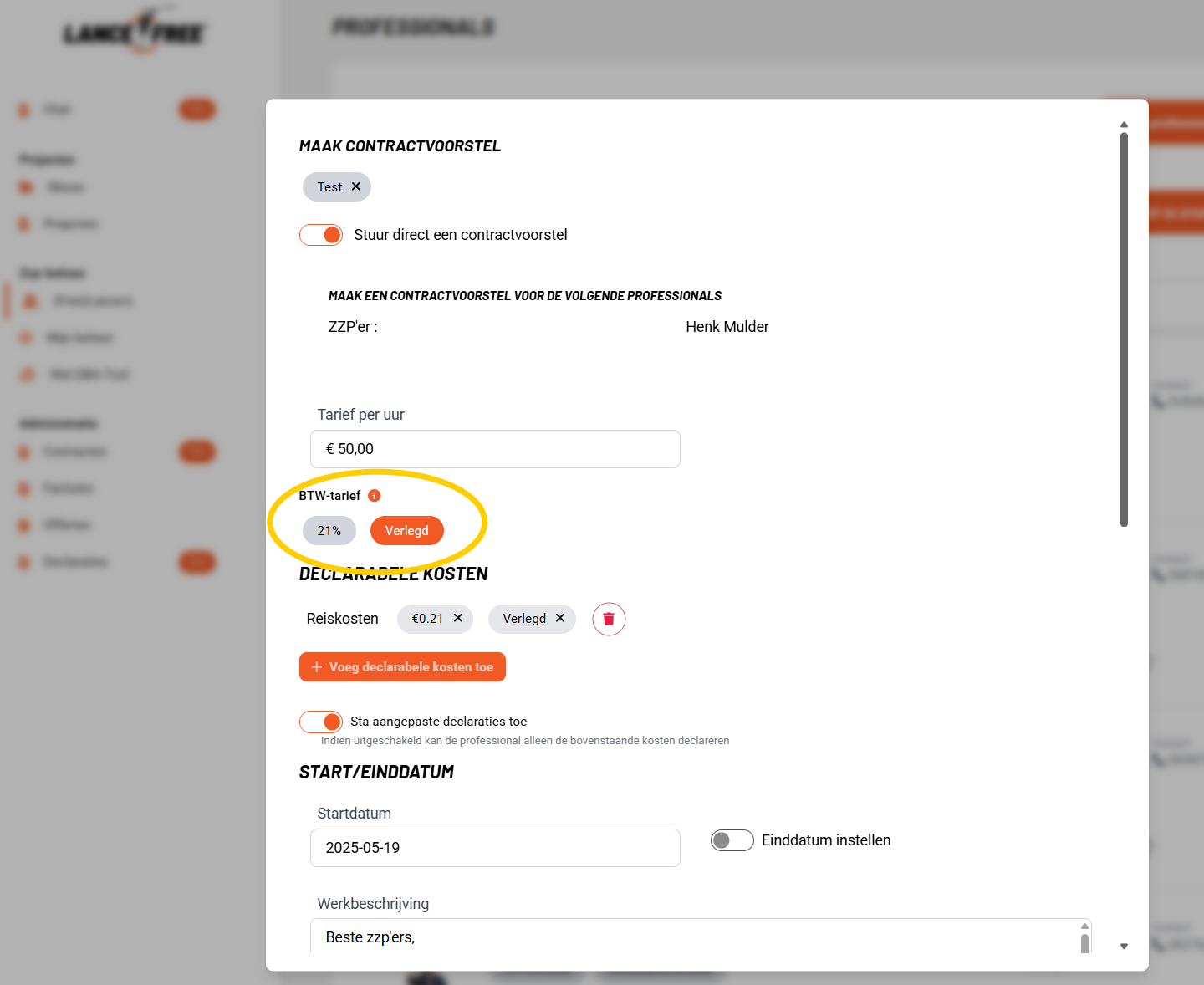 Bij het aanmaken of bewerken van contracten kun je nu het standaard BTW-tarief kiezen. Dit tarief wordt automatisch voorgesteld wanneer professionals urenstaten maken, maar kan indien nodig worden aangepast.