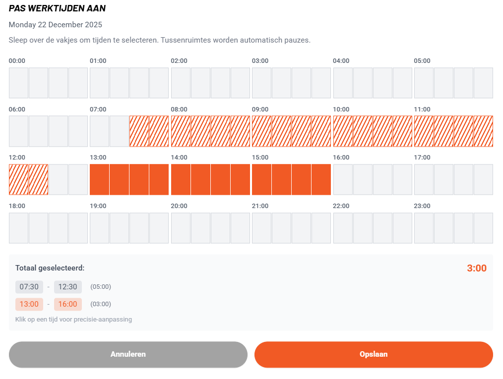 Bij het invoeren van uren kun je nu tijd selecteren door te slepen over een kalender. Je ziet direct welke uren al zijn ingevoerd en welke uren niet meer beschikbaar zijn omdat ze al in een andere urenstaat zitten. Dit voorkomt dubbele invoer en geeft overzicht.