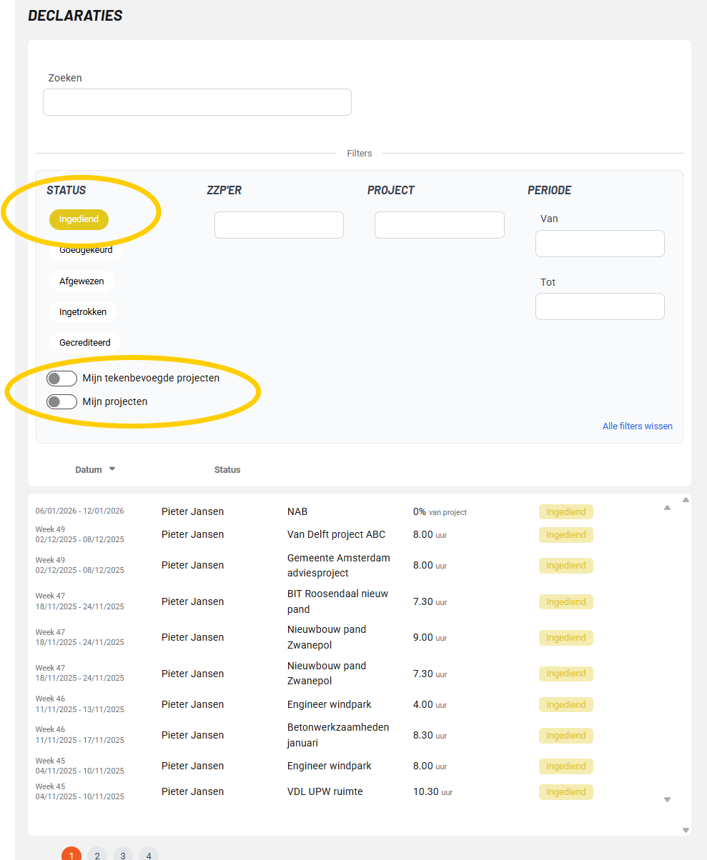 Als bedrijf krijg je veel verschillende declaraties binnen van zzp’ers, het is fijn om hier overzicht in te houden. Dit kan door in het menu op ‘Declaraties’ te drukken en te zoeken naar declaraties met de status ‘Ingediend’.