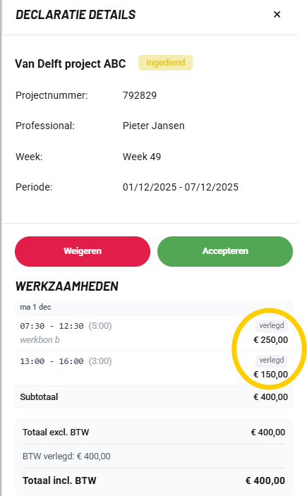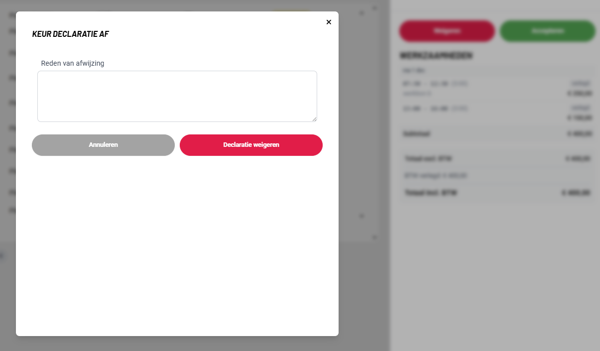 Indien een declaratie niet akkoord is klik je op weigeren en geef je een reden.