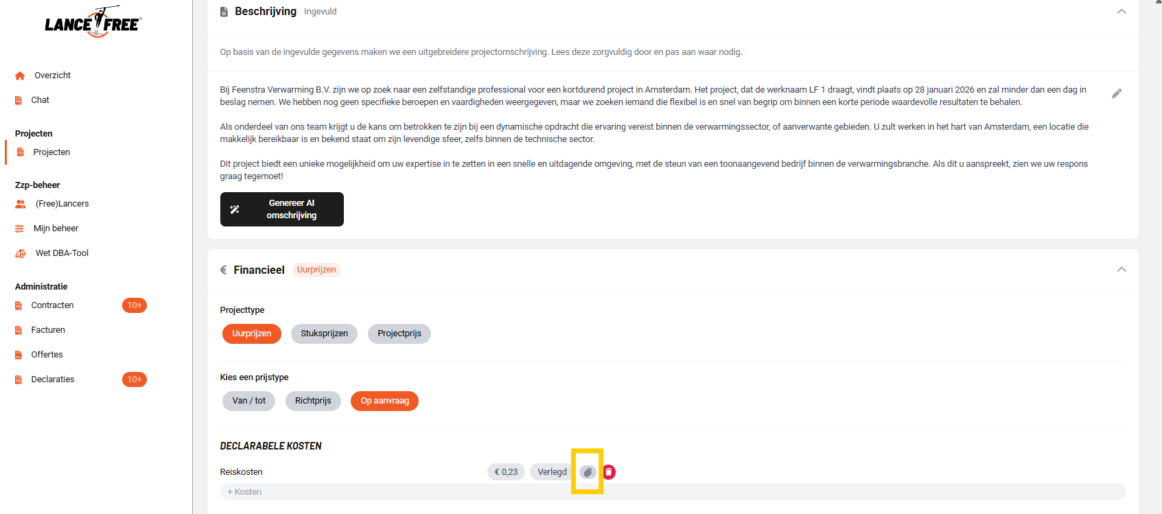 Bijlage bij declarabele kosten verplicht stellen - Wanneer je declarabele kosten onderdeel maakt van een overeenkomst en de zzp’er hier verplicht een bon of bijlage bij moet indienen, kan je dit nu al van te voren verplicht stellen in het project. Bijvoorbeeld voor parkeerbonnen of materiaal. Klik op het bijlage icoon zodat de bijlage verplicht wordt.