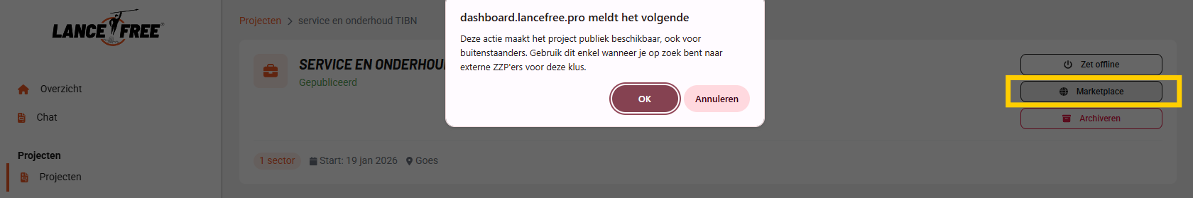 Project op de inhuur marketplace van Lance Free plaatsen vergt nu extra bevestiging - Bevestigingsvenster bij het publiceren naar Marketplace voorkomt per ongeluk openbaar maken van projecten.