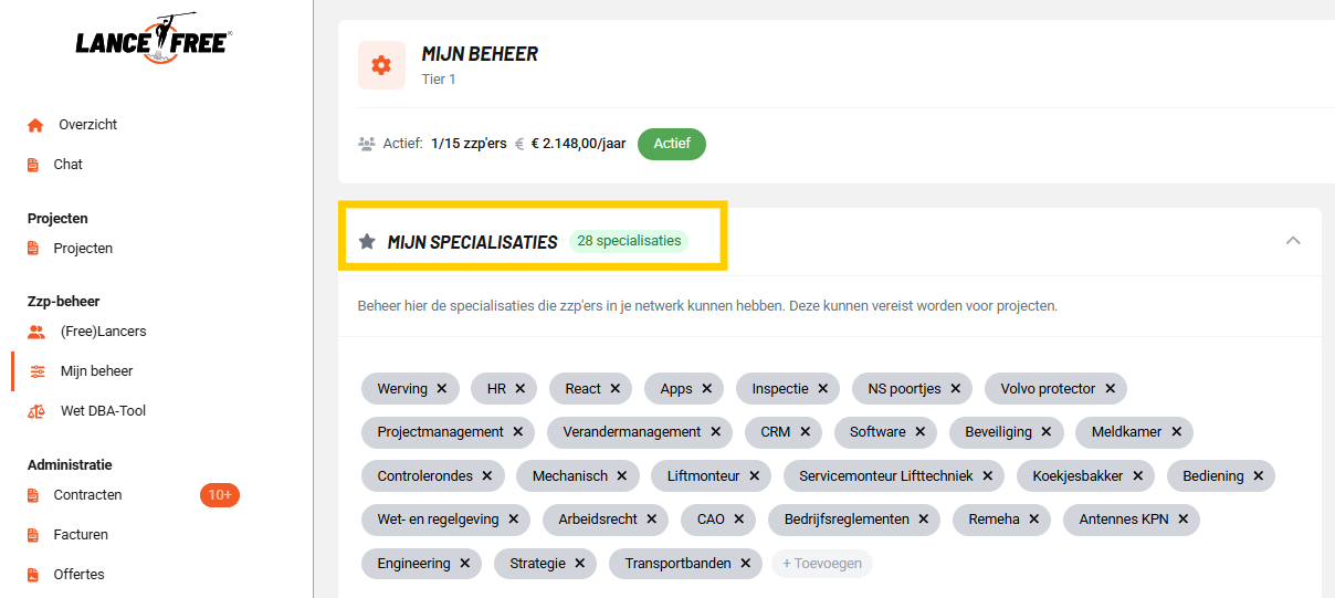 Eigen specialisaties - Bij Mijn Beheer kunnen nu specialisaties vereist worden. Per project kan je deze specialisaties verplicht stellen. De zzp’er moet de specialisatie dan bevestigen voor hij het werk kan uitvoeren. Ook kan je als bedrijf een specialisatie toewijzen aan een zzp’er en op specialisaties filteren in het zzp-netwerk.