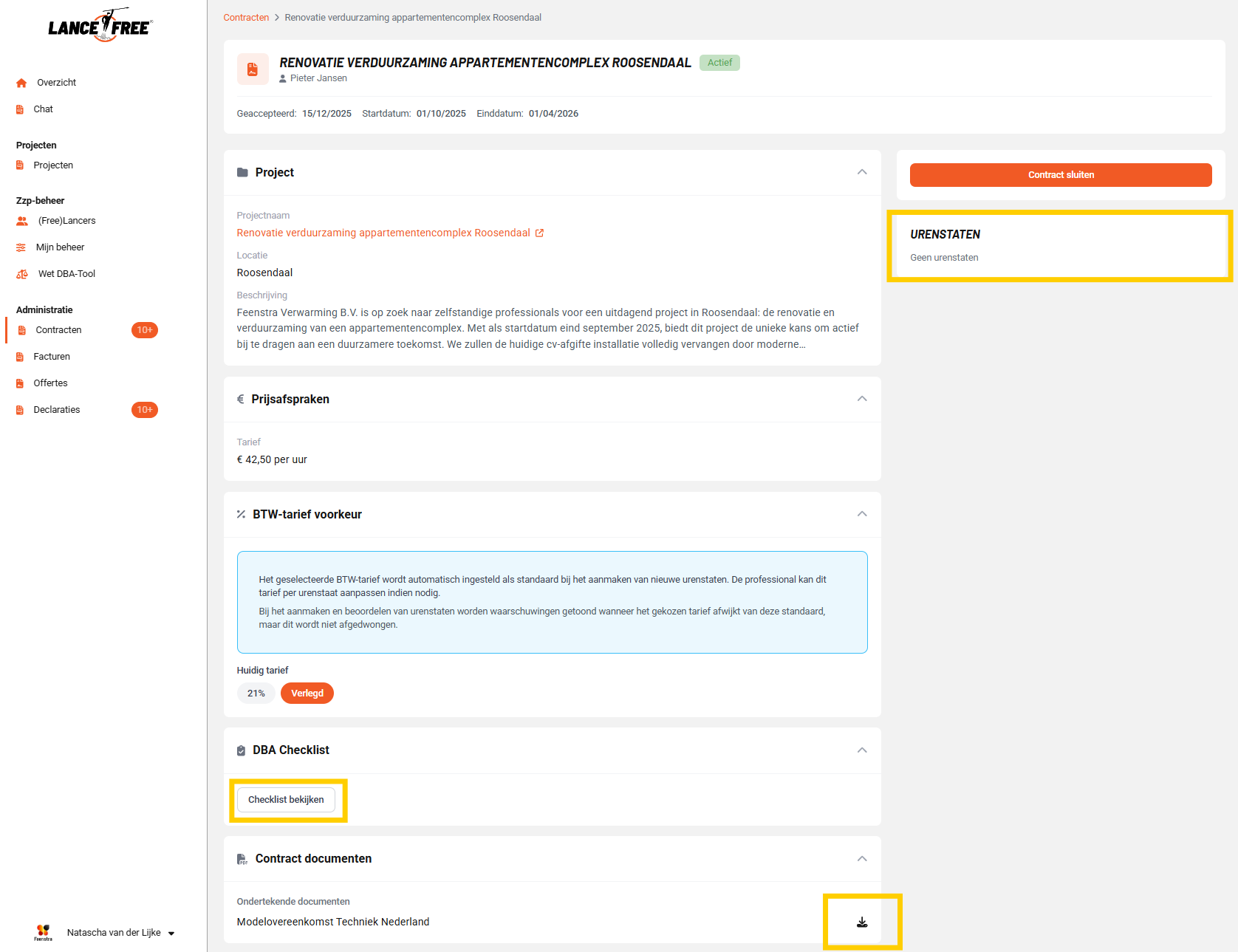 Nieuwe look voor contracten - Contracten staan nu verwerkt op één overzichtspagina. De DBA checklist en documenten zoals voorwaarden en modelovereenkomst zijn hier ook zichtbaar. Vanaf Urenstaten kan je naar alle eerder goedgekeurde urenstaten voor dit project. Wanneer je met ‘groepen toestaan’ werkt zal hier ook de consortium in beeld worden gebracht.