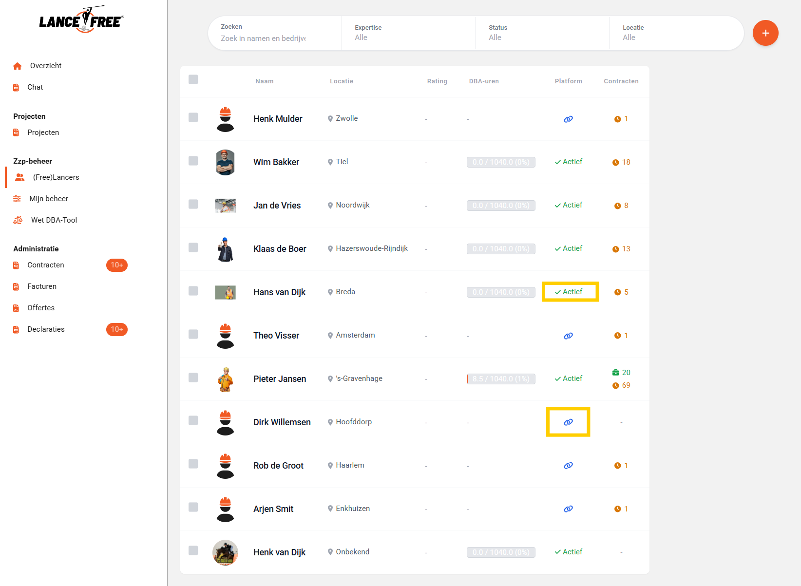 Staat er een blauw uitnodigingslinkje? Dan is de zzp’er nog niet aangemeld. Staat er een groen vinkje met daarnaast ‘Actief’ dan is de zzp’er actief en geverifieerd.