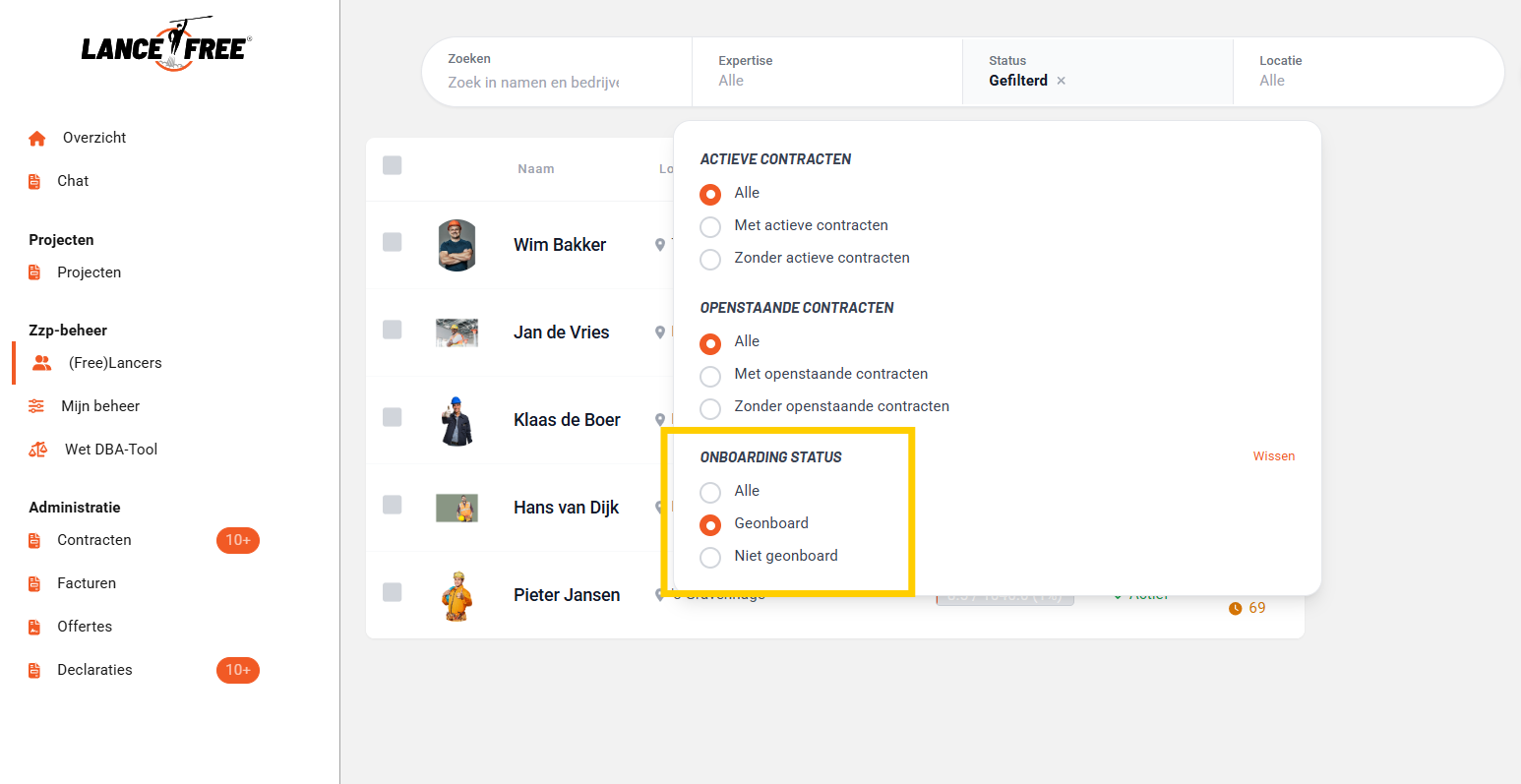 Ook kan je filteren in het zzp netwerk op status Geonboard: