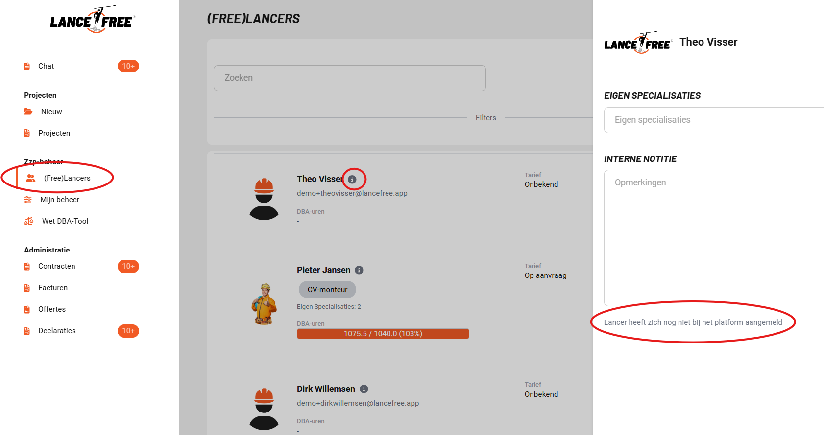 Rechts kan je onderaan zien of een zzp’er zich wel of niet heeft aangemeld bij het platform. Als de zzp’er zich nog niet heeft aangemeld dan zie je staan ‘Lancer heeft zich nog niet bij het platform aangemeld’.